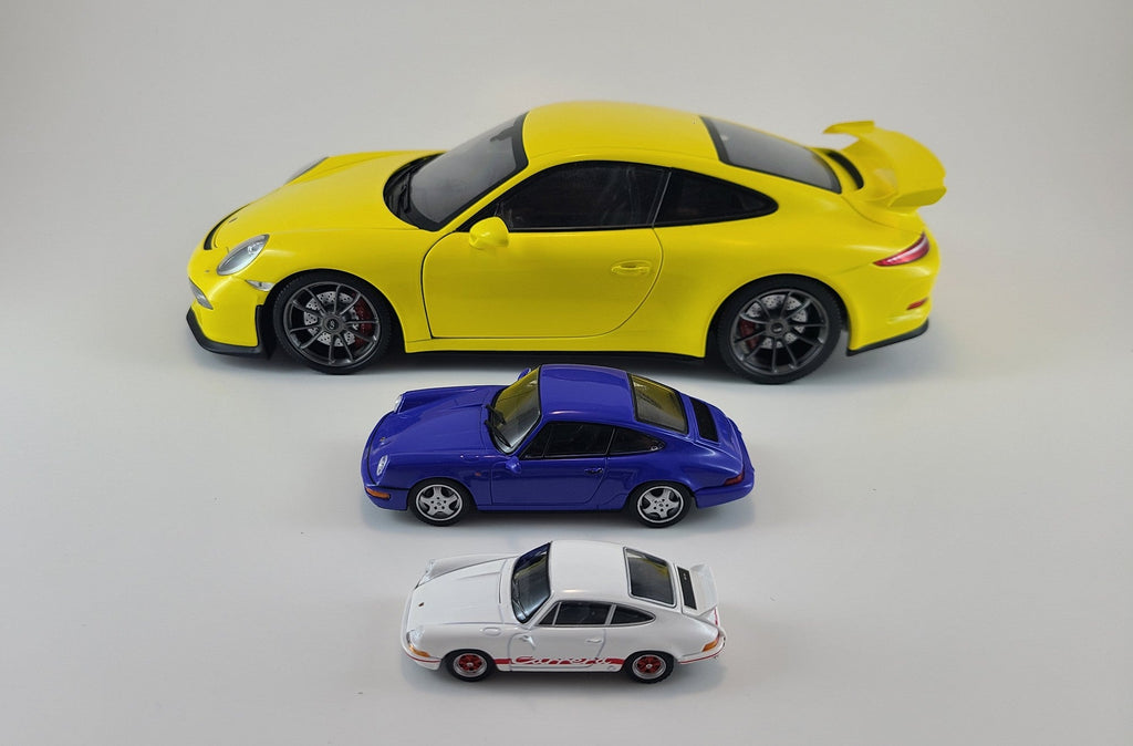 If you’re starting a model car collection from scratch, it’s critical to consider the space you have for your display, and that likely means choosing a scale of model that will best fit your spatial constraints. But what is scale? Newcomers to the diecast collecting hobby might be baffled by those oft-repeated numbers we veteran collectors always spout in reference to the size of the model car in question. Well, friends, scale is simply the ratio between the size of a miniature model car and that of its full-sized counterpart. When we talk about a 1:18-scale car, we mean that one unit of measurement on a model is equal to 18 units on the full-sized subject (in other words, 1 inch of model car for every 18 inches of real car). For example, a Porsche 992 Carrera is 177.9 inches long, so for a 1:18-scale model of this car to be accurately scaled, it would need to be about 9.9 inches long.